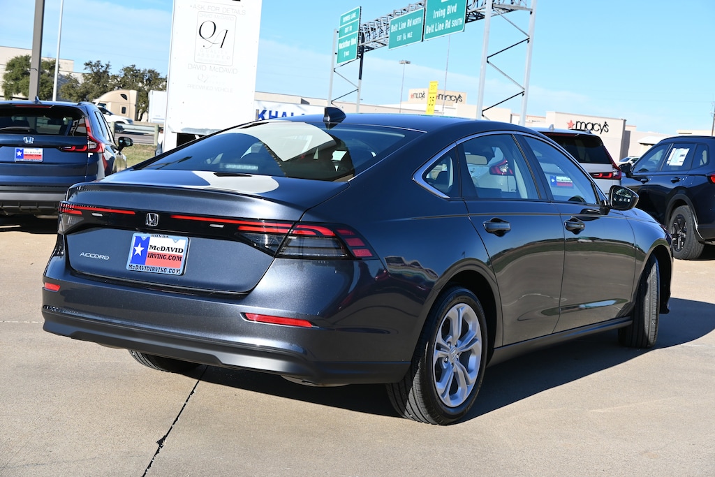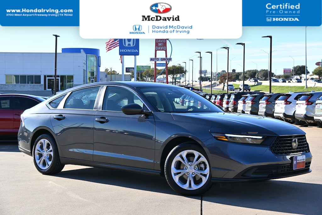 CERTIFIED! LOW MILES! This Meteorite Gray Metallic 2025 Honda Accord Sedan LX with Black interior is a 100% CARFAX Guarantee vehicle. This Accord Sedan is equipped with -Bluetooth Connectivity- -Keyless Entry- -Backup Camera- -Alloy Wheels- -Smart-Key-Push Button Start- -Front Bucket Seats- -Auto Climate Control- -Auxiliary Input- -Power Windows- -Power Locks- -Cruise Control- -Tire Pressure Monitoring System- -Traction Control- -Automatic Headlights- -Front Wheel Drive- -AM/FM Radio- -Security System- -Stability Control- -Steering Wheel Controls- -ABS Brakes- -Turbocharged- and many other amenities that are sure to please. Based on the excellent condition of this vehicle, along with the options and color, this Accord Sedan is sure to sell fast. Our pricing is very competitive and our vehicles sell quickly. Please call us to confirm availability and to setup a time to drive this Accord Sedan! Contact us at (469) 405-3340. We are located at 3700 W Airport Fwy, Irving, TX 75062
