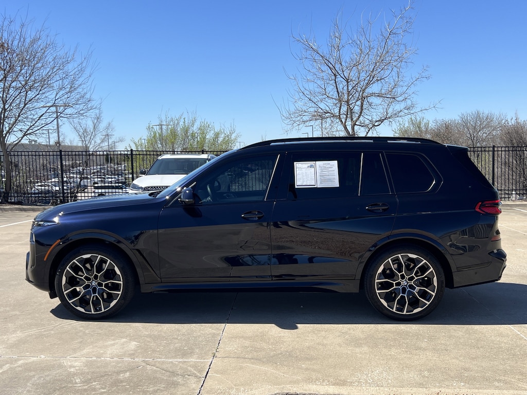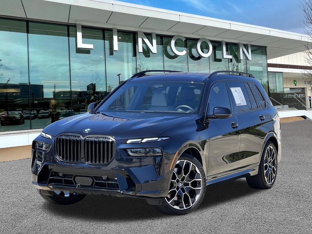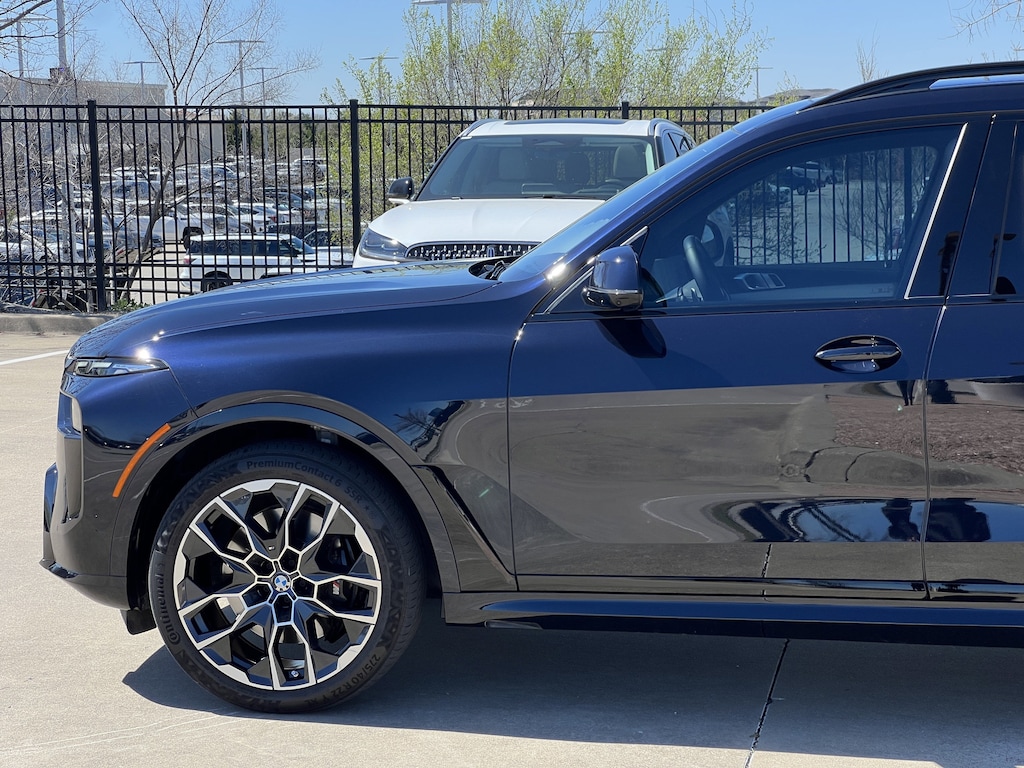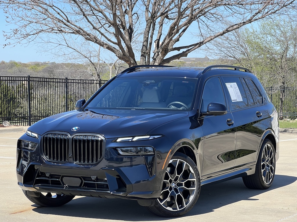 Clean CARFAX. Carbon Black Metallic 2025 BMW X7 xDrive40i AWD 8-Speed Automatic Sport 3.0L I6 DOHC 24V X7 xDrive40i, 4D Sport Utility, 3.0L I6 DOHC 24V, 8-Speed Automatic Sport, AWD, Carbon Black Metallic, Silverstone Premium Synthetic, 10 Speakers, 3.64 Axle Ratio, 3rd row seats: split-bench, 4-Wheel Disc Brakes, 5-Zone Automatic Climate Control, ABS brakes, Active Cruise Control with Stop and Go, Active Driving Assistant Pro, Adaptive suspension, Aerodynamic Kit, Air Conditioning, Alloy wheels, AM/FM radio: SiriusXM with 360L, AM/FM Stereo, Anthracite Alcantara Headliner, Apple CarPlay and Android Auto Compatibility, Apple CarPlay Compatibility, Auto High-beam Headlights, Auto tilt-away steering wheel, Auto-dimming door mirrors, Auto-dimming Rear-View mirror, Auto-leveling suspension, Automatic temperature control, BMW Assist ECall, BMW TeleServices, Brake assist, Bumpers: body-color, Climate Comfort Package, Compass, Connected Package Pro, ConnectedDrive Services, Delay-off headlights, Drive Recorder, Driver door bin, Driver vanity mirror, Driving Assistance Professional Package, Dual front impact airbags, Dual front side impact airbags, Electronic Stability Control, Emergency communication system: BMW Assist eCall, Extended Shadowline Trim, Exterior Parking Camera Rear, Four wheel independent suspension, Front and Rear Heated Seats, Front anti-roll bar, Front Bucket Seats, Front Center Armrest, Front dual zone A/C, Front reading lights, Front Ventilated Seats, Fully automatic headlights, Garage door transmitter, Genuine wood console insert, Genuine wood dashboard insert, Genuine wood door panel insert, Gesture Control, Harman/Kardon Surround Sound System, Head restraints memory, Heads-Up Display, Heated door mirrors, Heated front seats, Heated Multi-Contour Seats, Heated steering wheel, Hi-Fi Sound System, Highway Assistant, Illuminated entry, Illuminated Kidney Grille, Increased Top Speed Limiter, Knee airbag, Lane Keeping Assistant, Leather steering wheel, Live Cockpit Pro, Low tire pressure warning, M Sport Brakes with Black Calipers, M Sport Exhaust System, M Sport Package, M Sport Package Pro, M Sport Professional Package, M Steering Wheel, Memory seat, Navigation system: BMW Maps Navigation, Occupant sensing airbag, Outside temperature display, Overhead airbag, Panic alarm, Parking Assistance Package, Parking Assistant Professional, Parking View with 3D View (Surround View), Passenger door bin, Passenger vanity mirror, Personal ESIM 5G, Power adjustable front head restraints, Power door mirrors, Power driver seat, Power Front Seats, Power moonroof, Power passenger seat, Power steering, Power windows, Premium Package, Radio data system, Rain sensing wipers, Rear air conditioning, Rear anti-roll bar, Rear dual zone A/C, Rear Electric Side Window Shades, Rear reading lights, Rear seat center armrest, Rear window defroster, Rear window wiper, Reclining 3rd row seat, Remote keyless entry, Security system, Sensafin Upholstery, Shadowline Exterior Trim, SiriusXM Satellite Radio, Soft-Close Automatic Doors, Speed control, Speed-sensing steering, Speed-Sensitive Wipers, Split folding rear seat, Spoiler, Sport steering wheel, Steering wheel memory, Steering wheel mounted audio controls, Tachometer, Telescoping steering wheel, Tilt steering wheel, Traction control, Traffic Jam Assistant, Trip computer, Turn signal indicator mirrors, Variably intermittent wipers, Wheels: 21 x 9.5 Dual-Spoke Bicolor Orbit Grey, Wheels: 22 x 9.5 Front and 22 x 10.5 Rear Dual-Spoke, Wireless Charging Device, Without Lines Designation Outside.