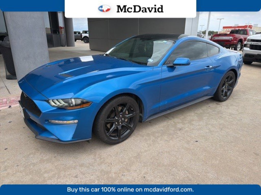 CARFAX One-Owner. Velocity Blue Metallic 2019 Ford Mustang EcoBoost RWD 10-Speed Automatic EcoBoost 2.3L I4 GTDi DOHC Turbocharged VCT AM/FM Stereo w/MP3 Player, Black Accent Package, Black Blade Decklid Spoiler, Black Front & Rear Pony Badges, Body-Color Blade Decklid Spoiler, Cloth Bucket Seats, Dual-Zone Automatic Temperature Control, Equipment Group 101A, Painted Black Roof, Reverse Sensing System, SiriusXM Radio, SYNC 3 Communications & Entertainment System, Wheels: 18 x 8 Machined-Face Aluminum, Wheels: 19 x 8.5 Ebony Black-Painted Aluminum.
