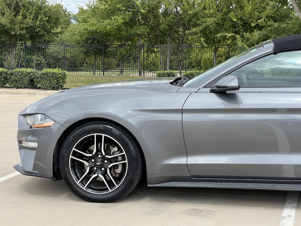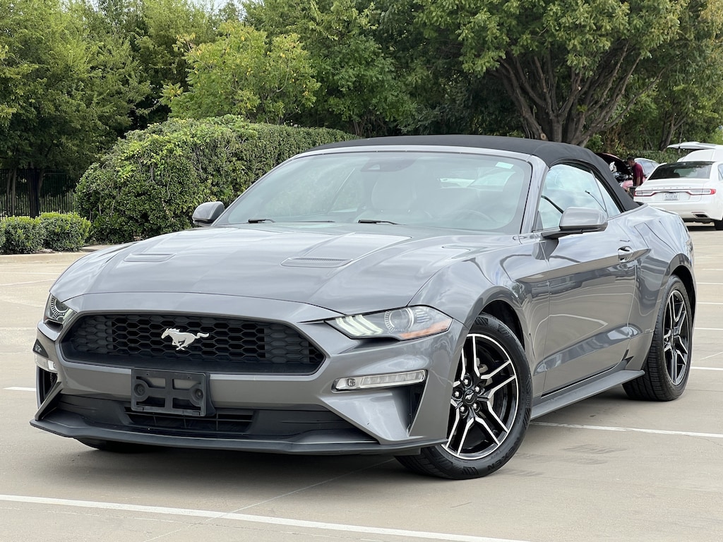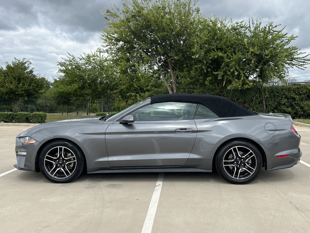 Clean CARFAX. Gray Metallic 2021 Ford Mustang EcoBoost Premium RWD 10-Speed Automatic EcoBoost 2.3L I4 GTDi DOHC Turbocharged VCT Mustang EcoBoost Premium, 2D Convertible, EcoBoost 2.3L I4 GTDi DOHC Turbocharged VCT, 10-Speed Automatic, RWD, Gray Metallic, Ceramic Premium Synthetic, 4-Wheel Disc Brakes, ABS brakes, Air Conditioning, Alloy wheels, AM/FM Stereo, Auto High-beam Headlights, Auto-dimming Rear-View mirror, Brake assist, Bumpers: body-color, Compass, Convertible roof lining, Delay-off headlights, Driver door bin, Driver vanity mirror, Dual front impact airbags, Dual front side impact airbags, Electronic Stability Control, Emergency communication system: 911 Assist, Exterior Parking Camera Rear, Four wheel independent suspension, Front anti-roll bar, Front Bucket Seats, Front Center Armrest, Front reading lights, Fully automatic headlights, Glass rear window, Illuminated entry, Knee airbag, Leather Shift Knob, Low tire pressure warning, Occupant sensing airbag, Outside temperature display, Overhead console, Panic alarm, Passenger door bin, Passenger vanity mirror, Power convertible roof, Power door mirrors, Power steering, Power windows, Radio data system, Rain sensing wipers, Rear anti-roll bar, Rear window defroster, Remote keyless entry, Security system, SiriusXM Radio, Speed control, Speed-sensing steering, Speed-Sensitive Wipers, Steering wheel mounted audio controls, SYNC 3 Communications & Entertainment System, Tachometer, Telescoping steering wheel, Tilt steering wheel, Traction control, Trip computer, Variably intermittent wipers, Voltmeter, Wheels: 18 x 8 Machined-Face Aluminum.