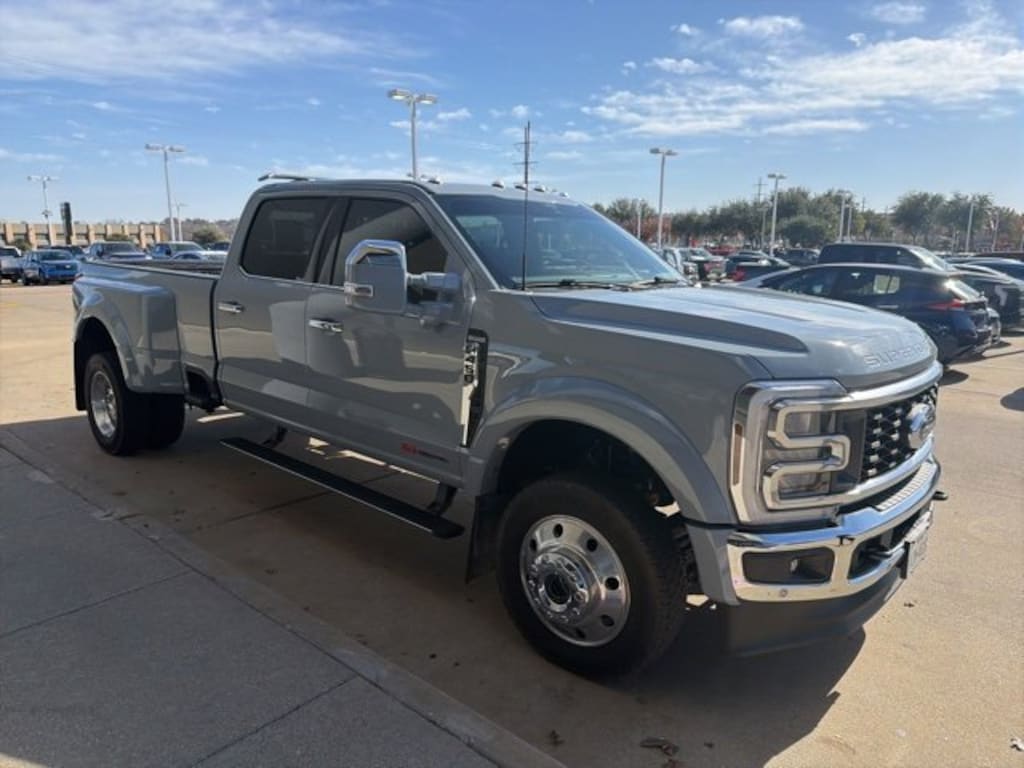 CARFAX One-Owner. Gray Metallic 2025 Ford F-450SD King Ranch DRW 4WD 10-Speed Automatic 6.7L High Output Power Stroke V8 Diesel BLUETOOTH, REAR BACK UP CAMERA, APPLE CAR PLAY, 4WD, Adjustable pedals, Alloy wheels, Camper Package, Compass, Emergency communication system: SYNC 4 911 Assist, Front dual zone A/C, Front fog lights, Fully automatic headlights, FX4 Off-Road Package, Garage door transmitter, GVWR: 14,000 Lb Payload Package, Heated front seats, Heated rear seats, Heated steering wheel, Hill Descent Control, Memory seat, Navigation System, Off-Road Specifically Tuned Shock Absorbers, Outside temperature display, Pedal memory, Power door mirrors, Power driver seat, Power steering, Power windows, Pro Power Onboard - 2kW, Radio: B&O Unleashed Sound System by Bang & Olufsen, Rain sensing wipers, Rear Stabilizer Bar and Auxiliary Springs, Remote keyless entry, SiriusXM Radio with 360L, SYNC 4 with Enhanced Voice Recognition, Telescoping steering wheel, Tilt steering wheel, Turn signal indicator mirrors, Twin Panel Power Moonroof, Unique FX4 Off-Road Box Decal.